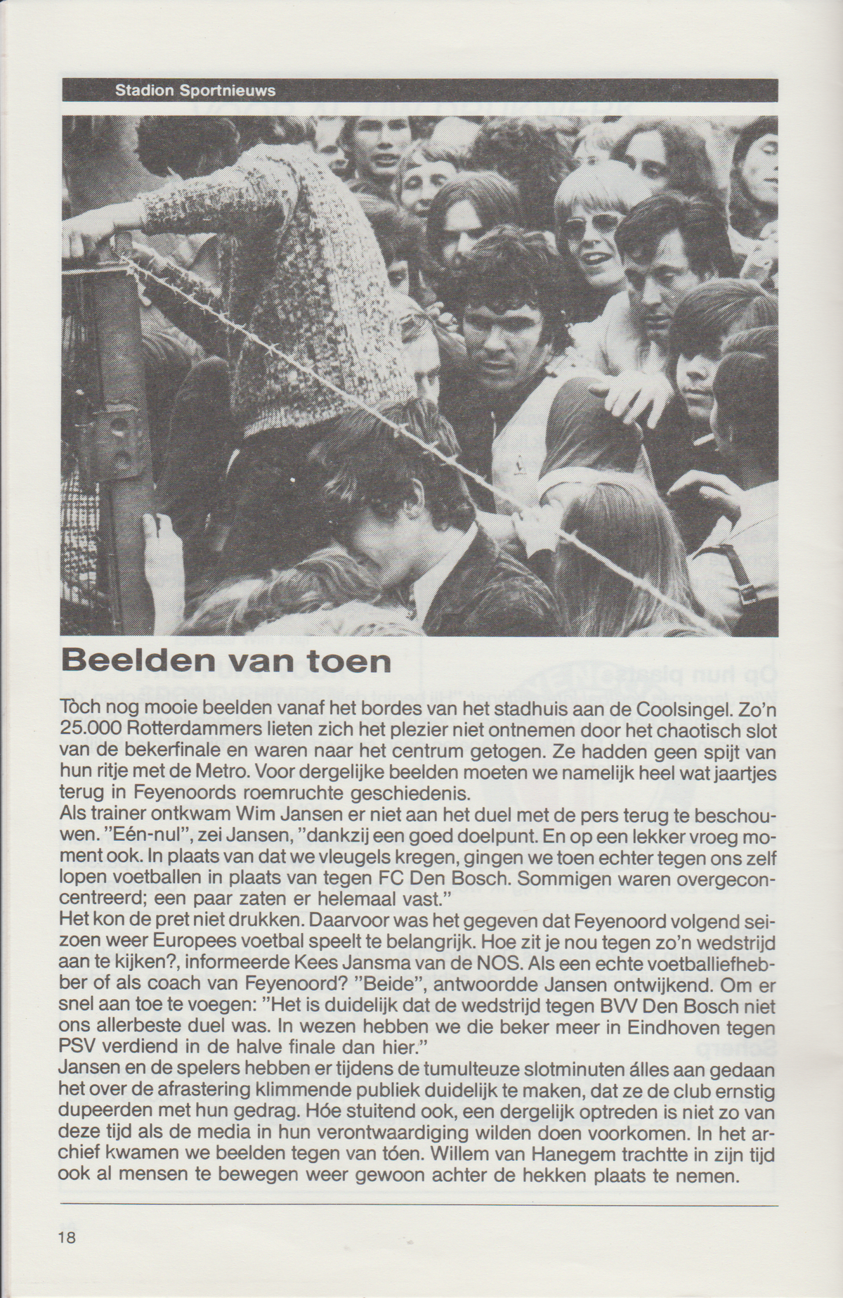 Feyenoord greep het duel met stadgenoot Sparta aan om de ereronde te voltooien die het vorige week na afloop van de gewonnen bekerfinale niet had kunnen maken, omdat talloze fans meenden het veld te moeten bezetten. De Rotterdamse derby die volgde kon het 15 000 koppige publiek beter bekoren dan de slappe vertoning van een week eerder tegen de nummer zeventien van de eerste divisie, BVV Den Bosch.